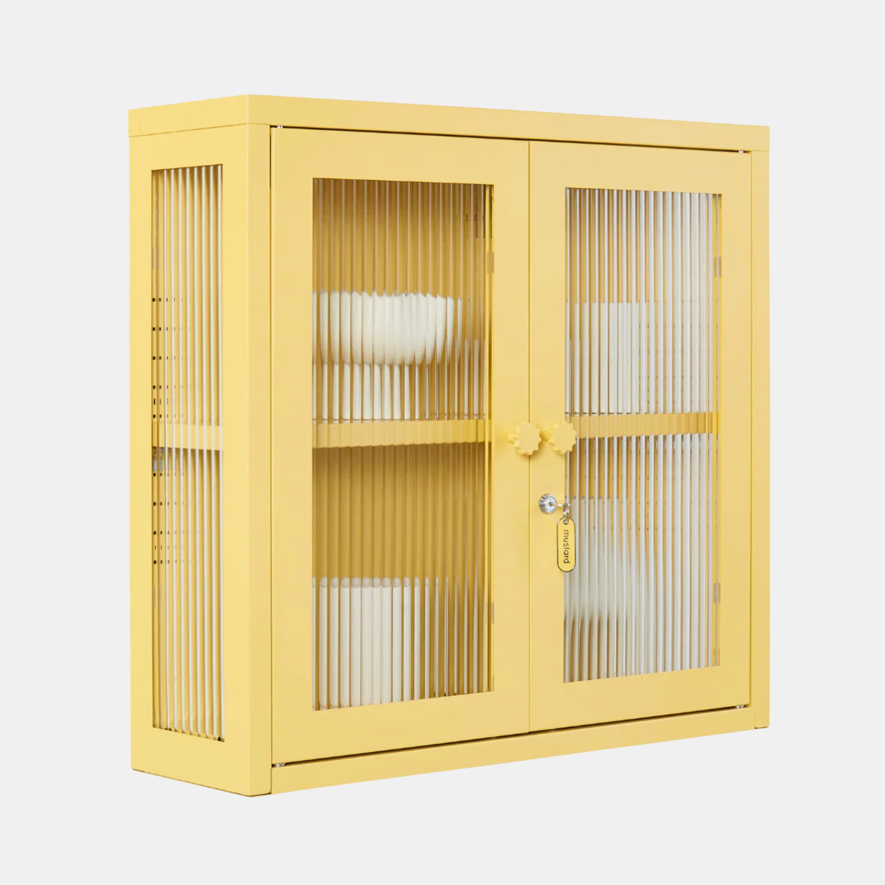 Inside, you'll find an adjustable shelf, a door bolt and a subtle embossed 'mustard', to let you know it's the real deal. Outside, fluted glass panels are set in a metal frame with medallion handles, a lock, a custom Mustard enamel keyring and wall attachment points.