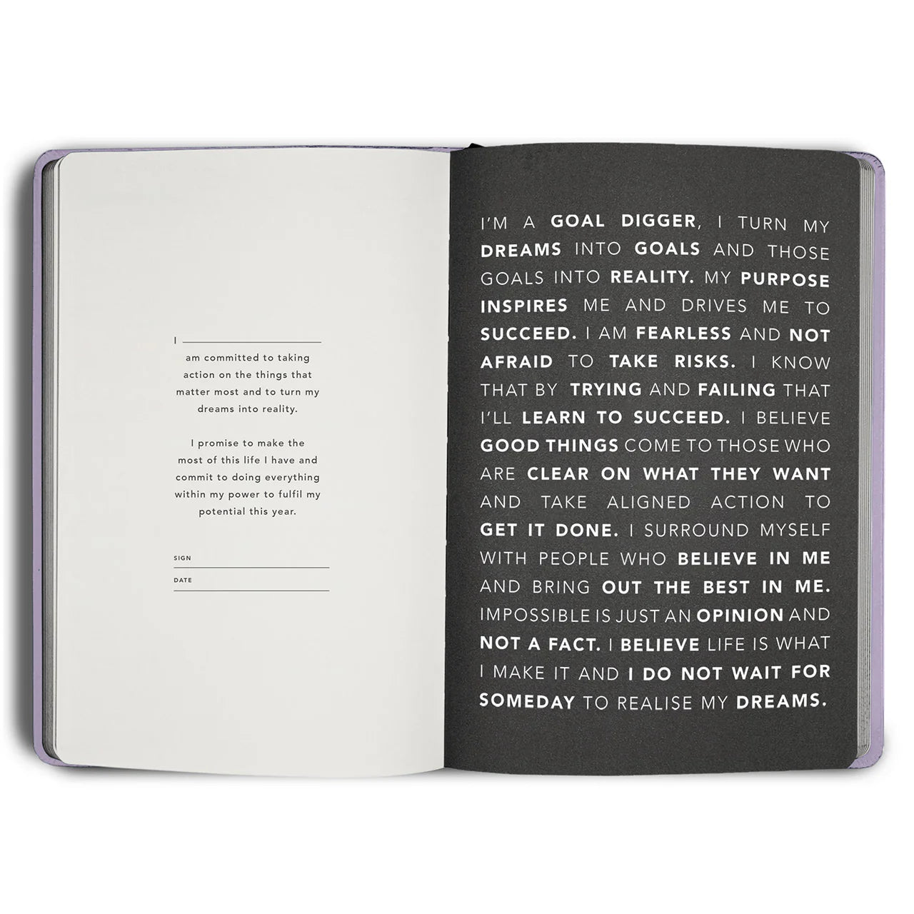 Features 2 divider ribbons, debossed cover design, fountain pen-friendly paper, short- and long-term goal-planning, mind-mapping space, monthly reviews, progress tracker, budgeting section