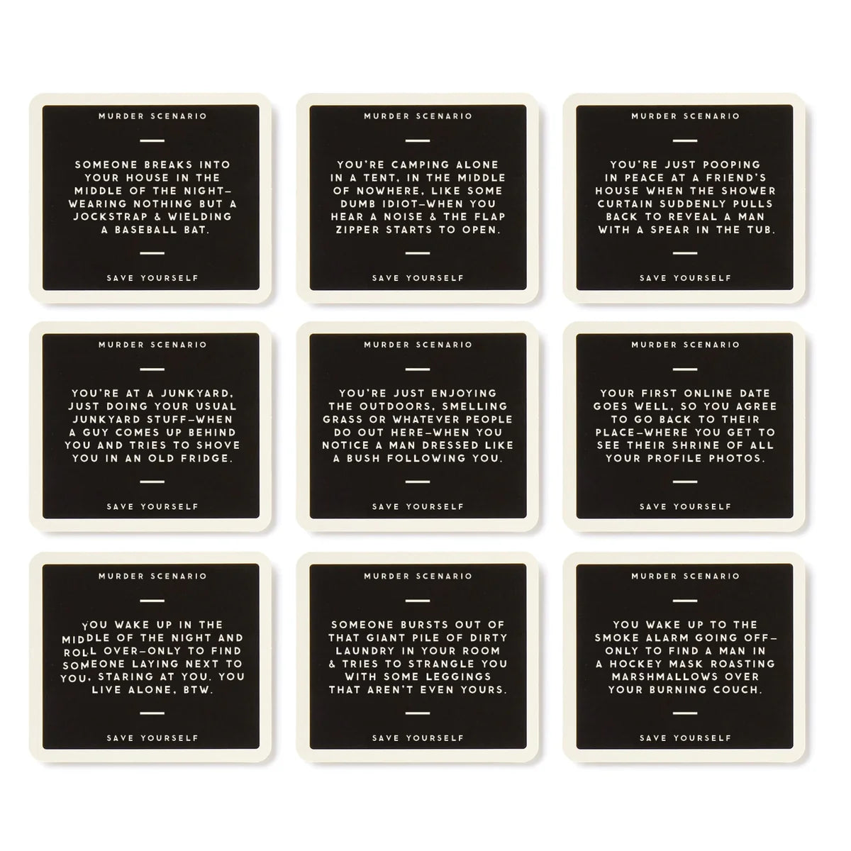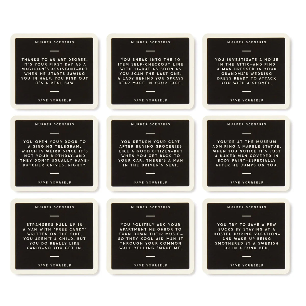 Everybody loves a good murder–well, except for the murderee that is. In this hilarious party game players try to devise the best plan to escape from a series of entertainingly ‘murder-y’ situations—but even better, there’s a twist. See, you only have 3 randomly drawn objects at your disposal to use—anything from a rubber duck to a can of spray cheese. With endless possibilities and endless laughter, this game is guaranteed to keep the party going long into the night!