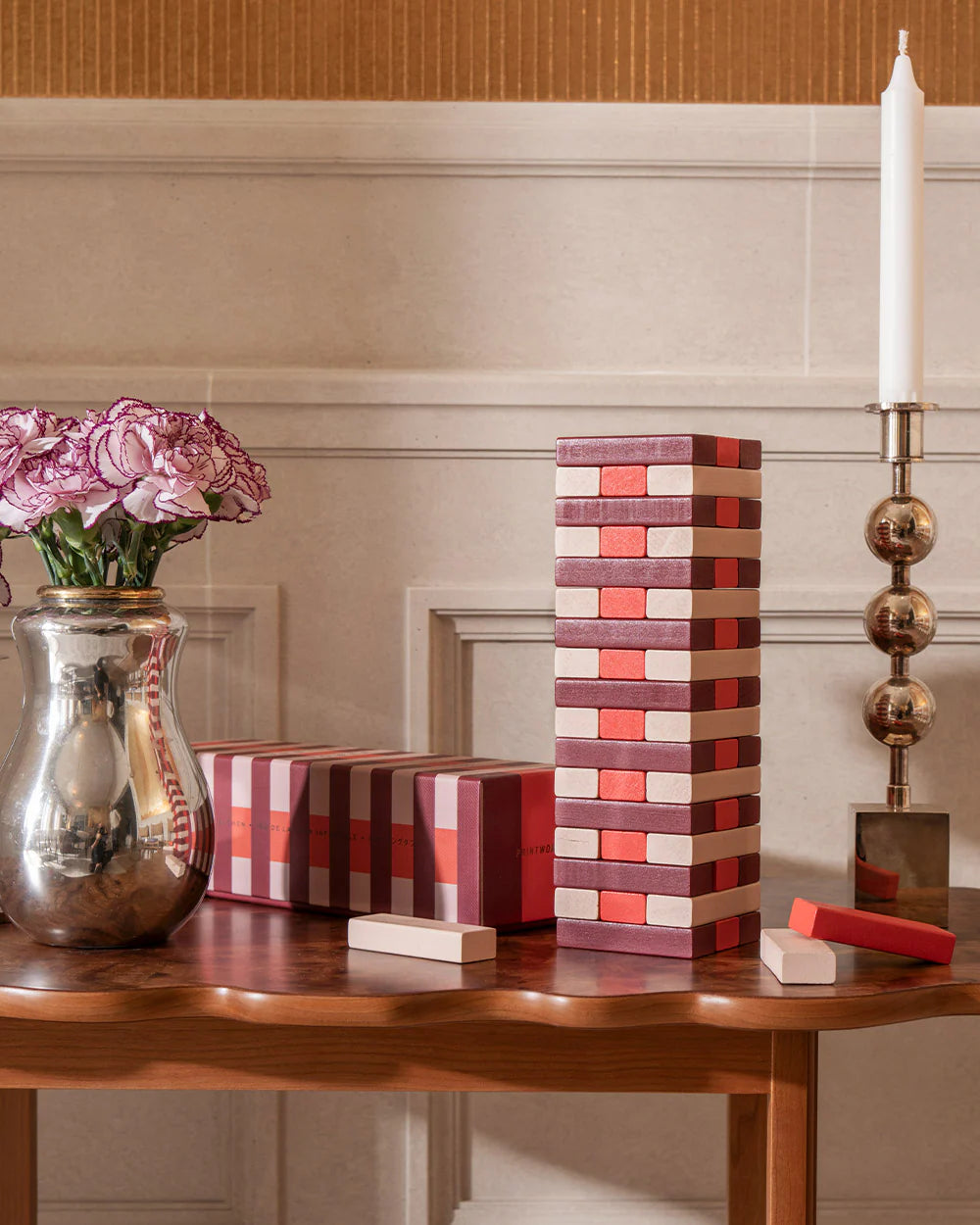 A classic game, now in bold red. Our Tumbling Tower adds a playful pop to any room - made of solid wood and designed to stand out. Whether you're playing with friends or adding color to your shelf, it's made to last and to be loved. Includes instructions in English, French, and German.