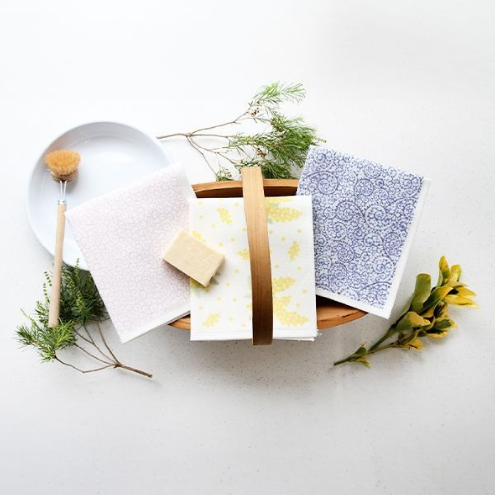 Made in Nara, the dish cloth features a 6 layer weave that increases water absorbency and durability. Textured surface means better cleaning power while damp. Dries quickly after use. Fabric gets softer with use. To achieve softness faster, soak in hot water for 5 minutes. Avoid contact with bleach and do not put into the dryer.